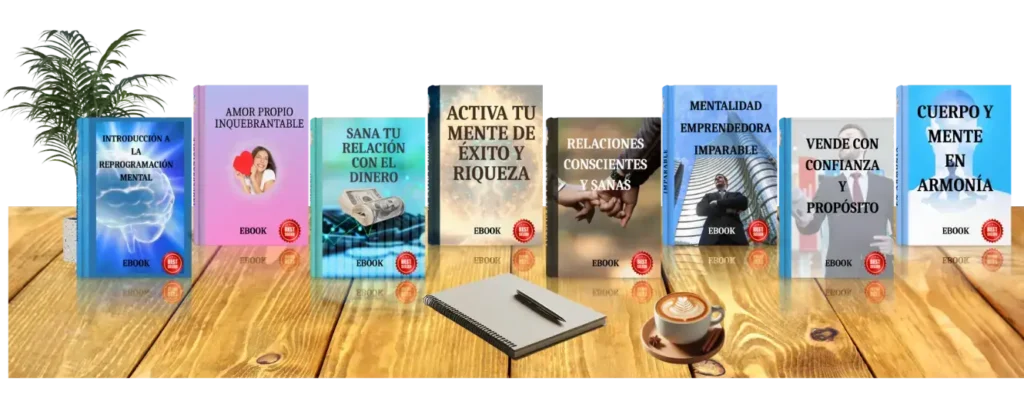 Recibirás 8 eBooks transformadores que trabajan a nivel profundo tu mente subconsciente para que dejes de autosabotearte y empieces a vivir alineado con lo que realmente deseas: